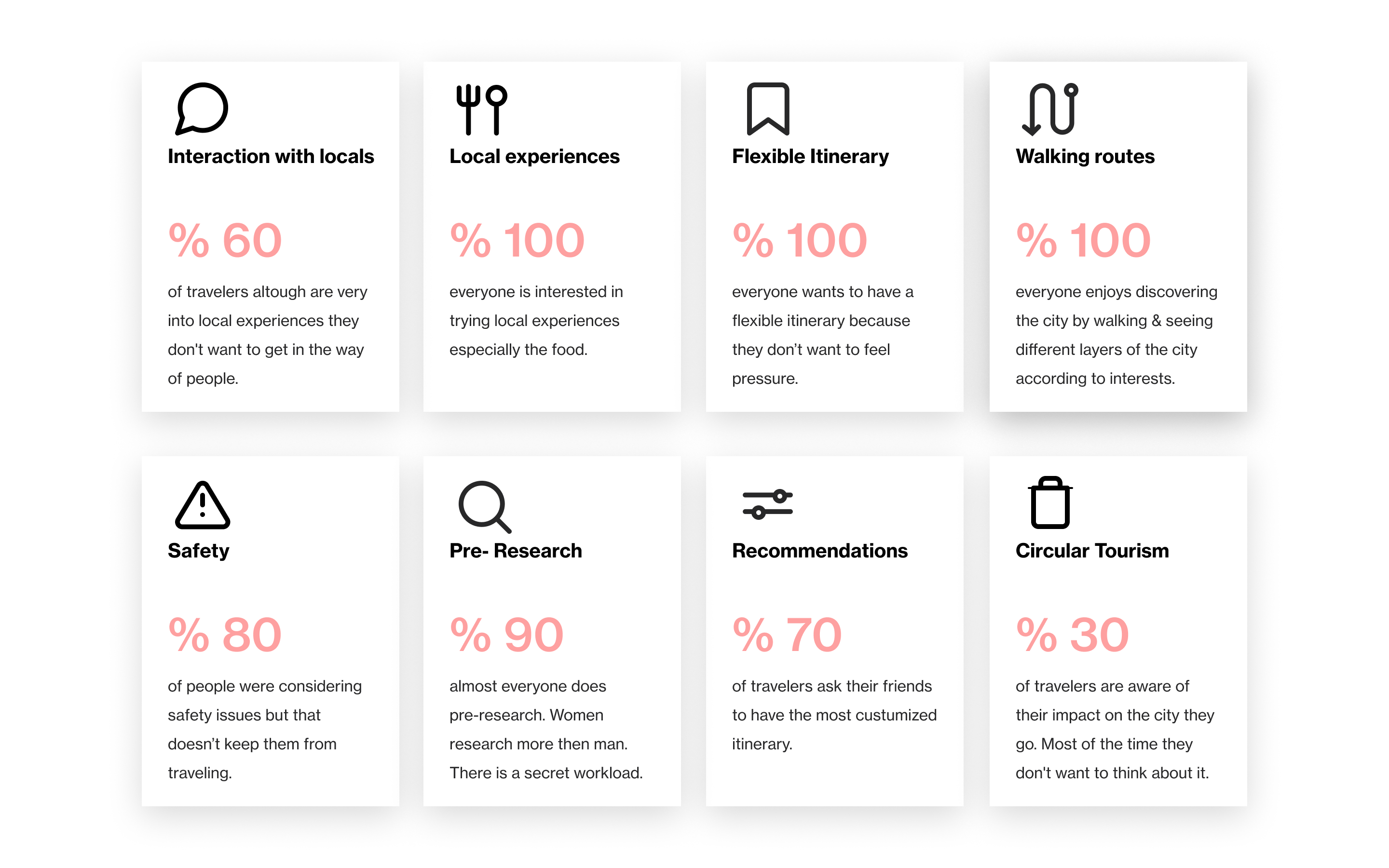 To solve these problems, I started with understanding the main problems of discovering a new city by desk research. I was a member of a Facebook group called Women Who Travel by Condé Nast and I was always a good follower of New York Times travel articles. They helped me to understand the main and common problems for travelers as well as existing apps and websites. I needed to dig deeper so I continued my research with user interviews.